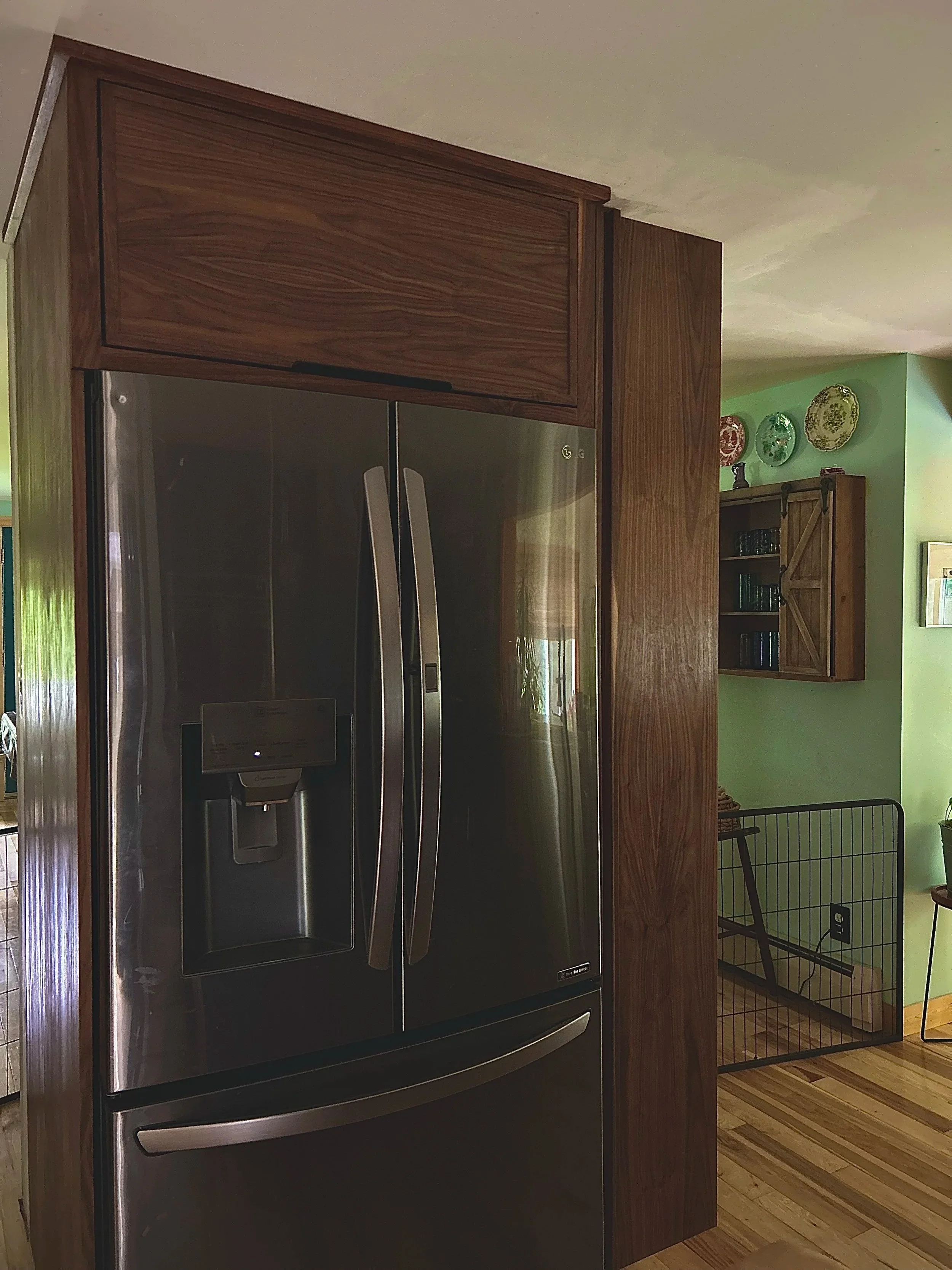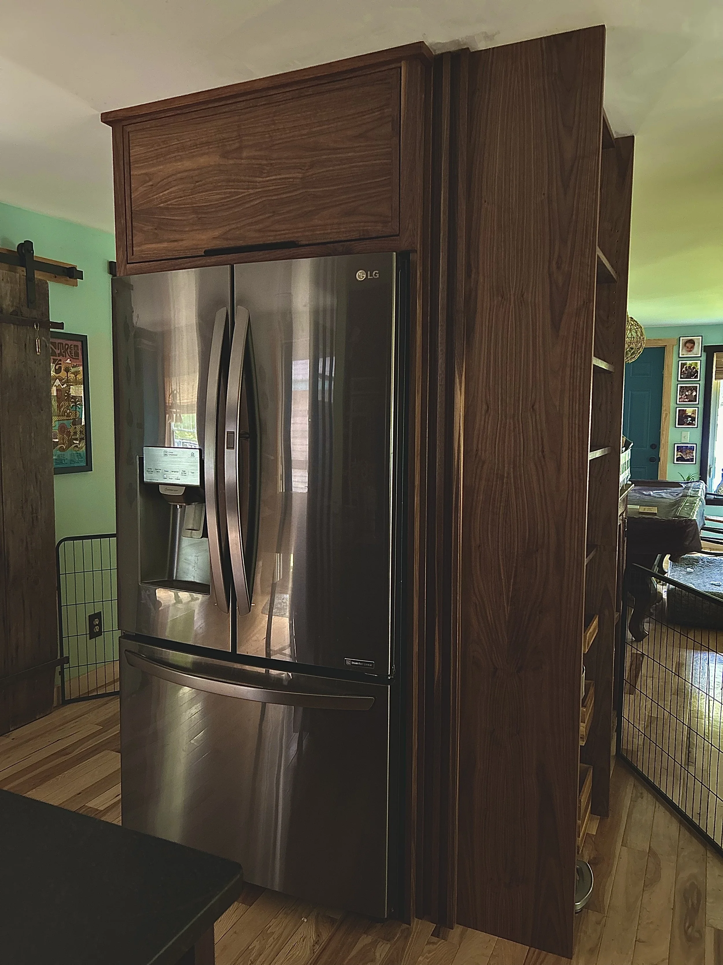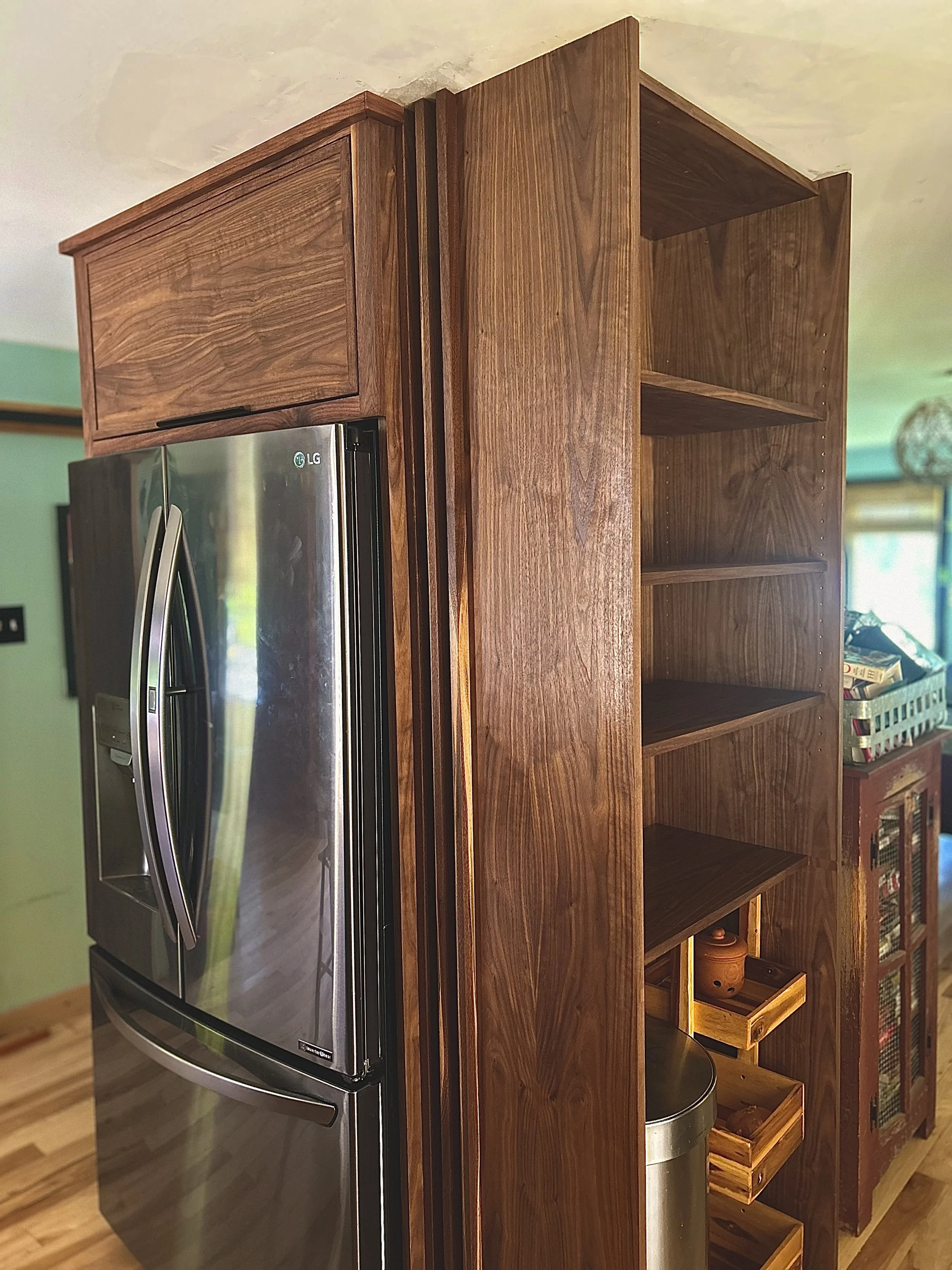 custom built fridge cabinet with cook book built in on side